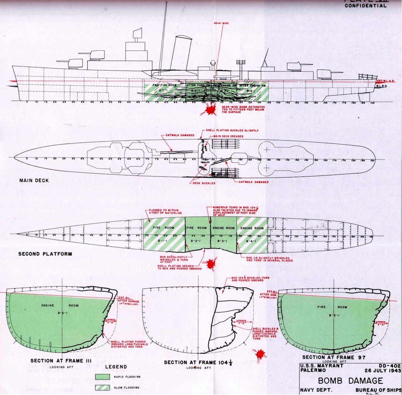 | 379k | USS Mayrant (DD-402) bomb damage diagram from July 26, 1943 off Palermo. Source: Navy Department Library: Destroyer Gunfire, Bomb and Kamikaze Damage Report; War Damage Report No. 51. | Mike Green |