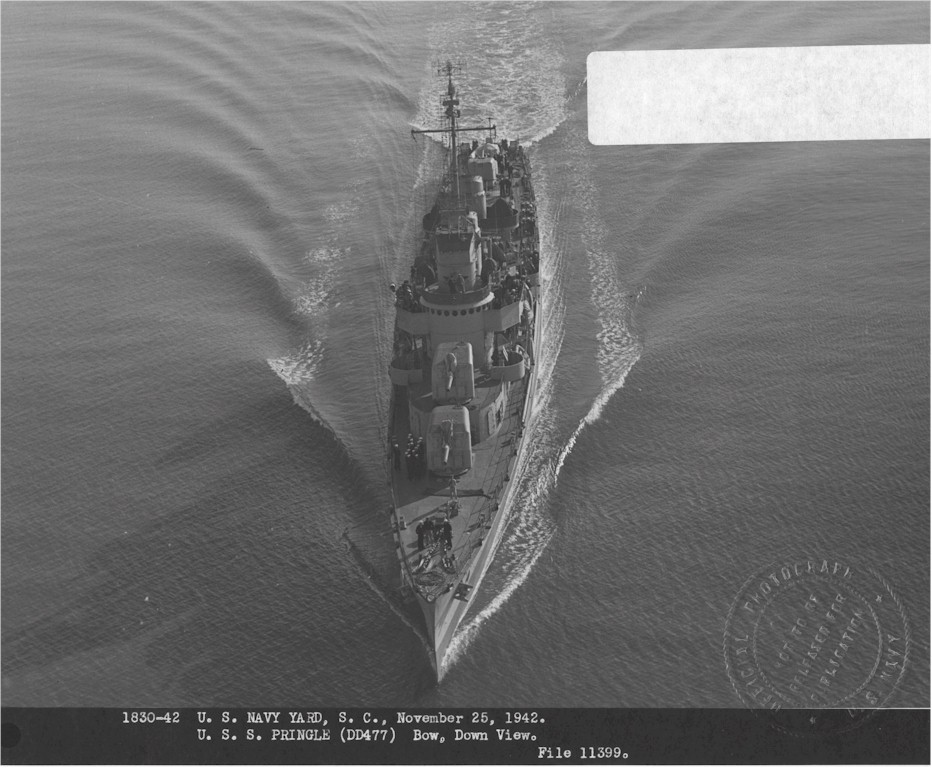 | 215k | USS Pringle (DD-477) off Pearl Harbor. Photo received by Bureau of Ships in July 1943. Source: United States National Archives, Photo No. 19-N-48619. | Mike Green |