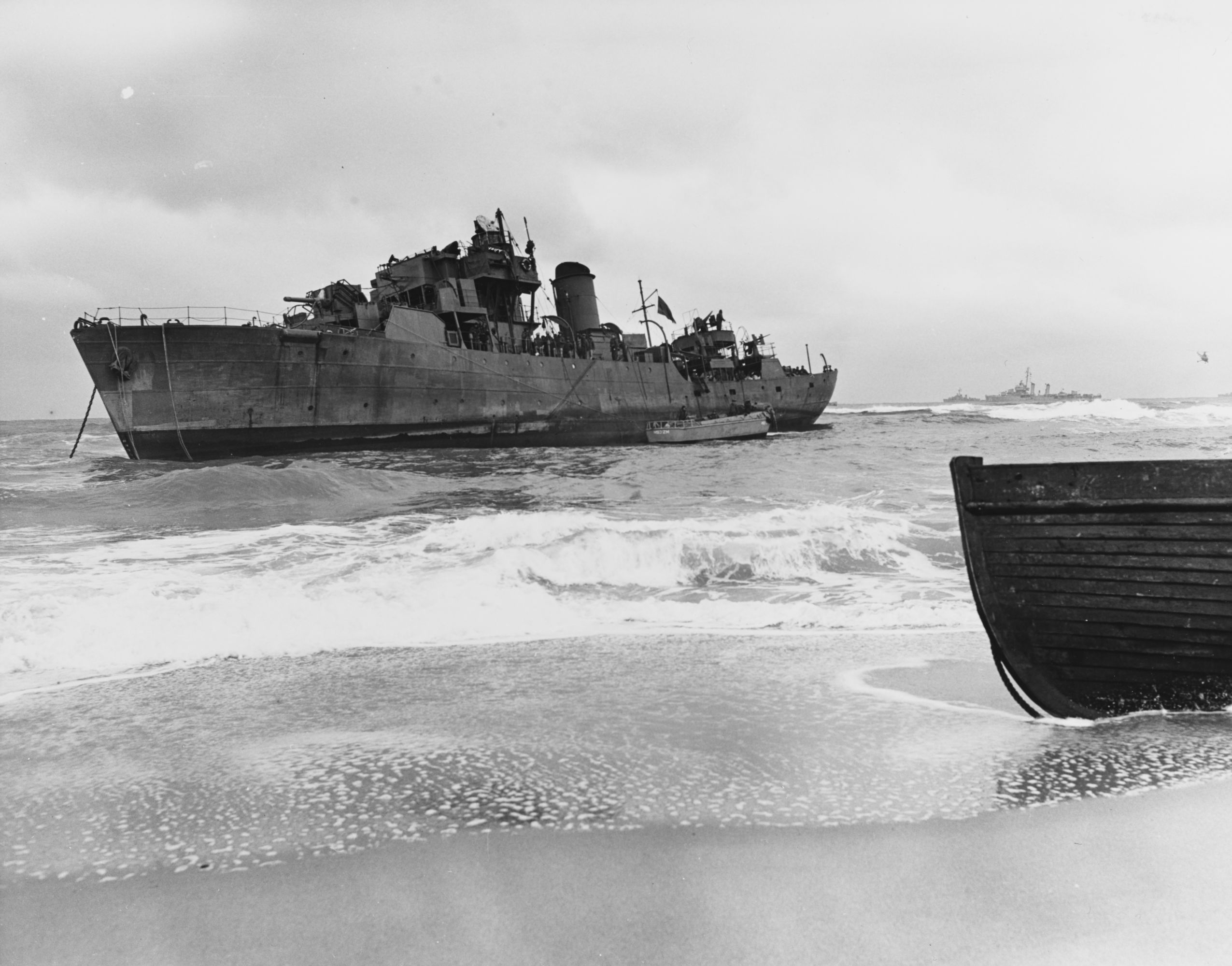 | 104k | Thai frigate Prasae stranded behind enemy lines on the Korean east coast, January 1951. She had gone ashore in a snowstorm on 7 January and had to be destroyed after unsuccessful efforts to pull her off. A helicopter and several U.S. Navy ships, including USS Endicott (DMS-35), are offshore covering salvage operations. Prasae was formerly the British corvette Betony and the Indian Navy's Sind. National Archives photo 80-G-432568. | Fred Weiss |