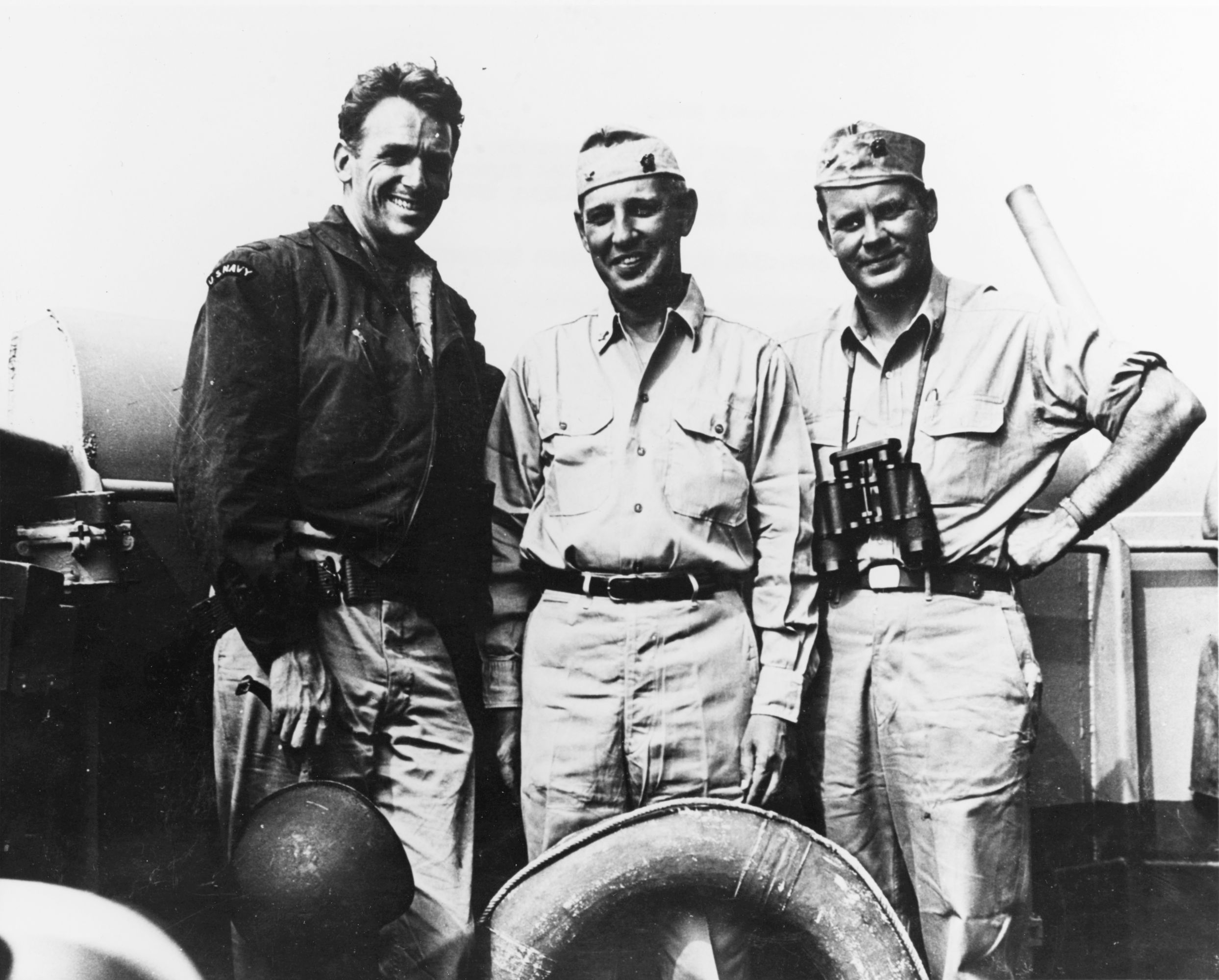 | 480k | Lieutenant Commander Douglas Fairbanks, Jr., USNR, Commander of the Special Operations Group's Eastern Diversionary Unit, Captain Henry C. Johnson, Commander Special Operations Group (CTG 80.4) and Lieutenant Commander John D. Bulkeley, USN, Commanding Officer of USS Endicott (DD-495) on Endicott's bridge during the Southern France Operation, August 1944. This was likely taken after the 17 August engagement (the "Battle of La Ciotat")that sank the German (formerly Italian) corvette UJ.6082 (ex-Antilope) and the armed yacht UJ.6073 (ex-Nimet Allah).