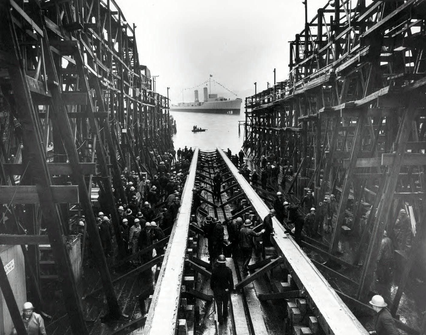 | 266k | Workers looking down the ways at the USS Endicott (DD-495), which had just been launched at the Seattle Yard of Seattle-Tacoma Shipyards, 02 April 1942.