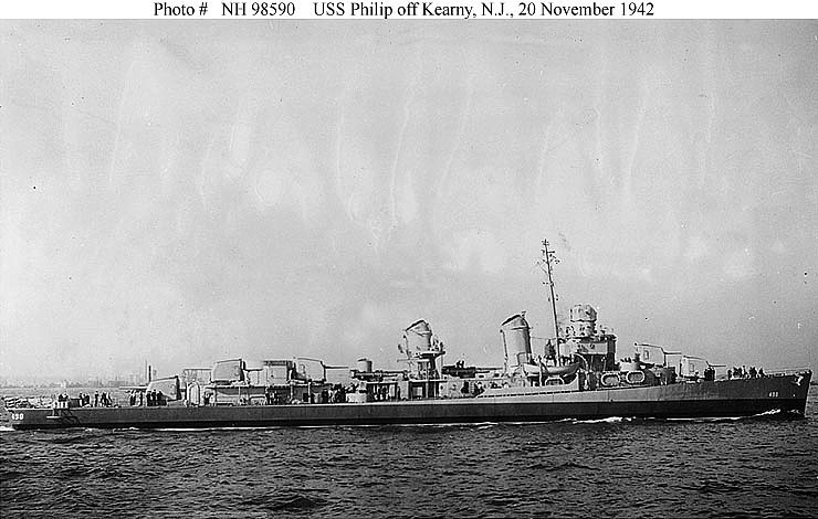 | 94k | USS Philip (DD-498) underway on her delivery voyage, off Kearny, New Jersey, 20 November 1942. Official U.S. Navy Photograph, from the collections of the Naval Historical Center. | Fred Weiss | |