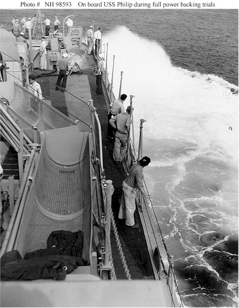 97k | USS Philip (DDE-498) view on board, looking aft on the port side, as she backed all engines to go from flank speed ahead to full speed astern, during trials following her conversion to an antisubmarine escort destroyer. The original print, released by Fifth Naval District Public Information Office, carried the stamped date 16 June 1950. Note Philip's empty floater net trays and hose reels. Official U.S. Navy Photograph, from the collections of the Naval Historical Center. | Fred Weiss | |