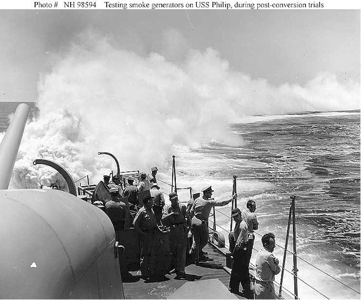 124k | USS Philip (DDE-498) View on board, looking aft as the ship tested her smoke generators during trials following her conversion to an antisubmarine escort destroyer. The trials were run off the Virginia Capes. The original print was released by Fifth Naval District Public Information Office in June 1950. Official U.S. Navy Photograph, from the collections of the Naval Historical Center. | Fred Weiss | |