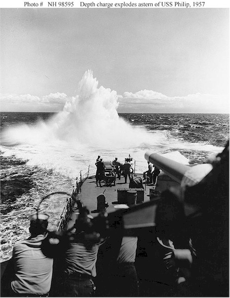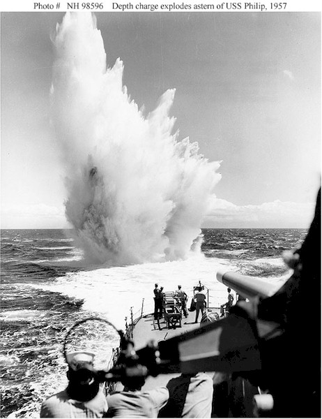 74k | USS Philip (DDE-498) Depth charge explodes astern, during operations off the Hawaiian Islands, 28 May 1957. Official U.S. Navy Photograph, from the collections of the Naval Historical Center. | Fred Weiss | |