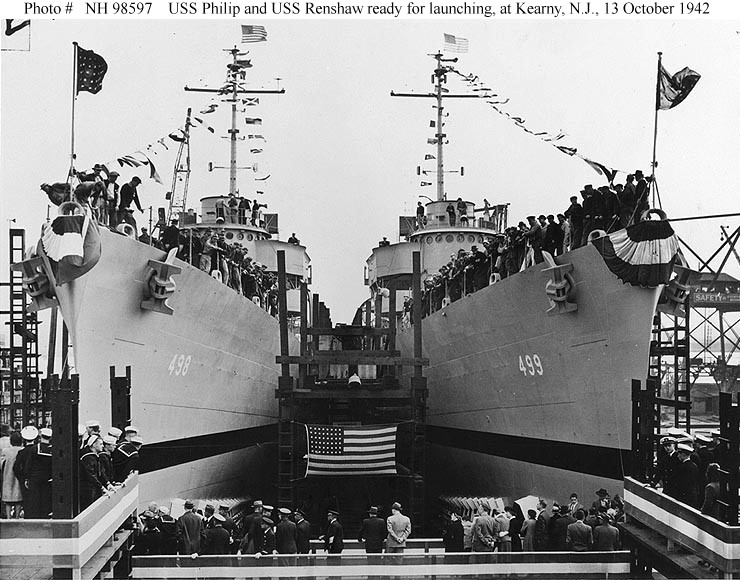 | 135k | USS Philip (DD-498), at left and USS Renshaw (DD-499) ready for launching, during dual christening ceremonies at the Federal Shipbuilding and Dry Dock Company shipyard, Kearny, New Jersey, 13 October 1942. Courtesy of Donald M. McPherson, 1975. U.S. Naval Historical Center Photograph. | Fred Weiss | |