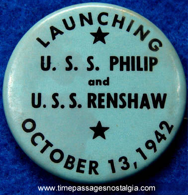 | 61k | Souvenir button of the launching of the USS Philip (DD-498) and USS Renshaw (DD-499) on October 13 1942. Courtesy of www.timepassagesnostalgia.com. | Tom Kerman | |