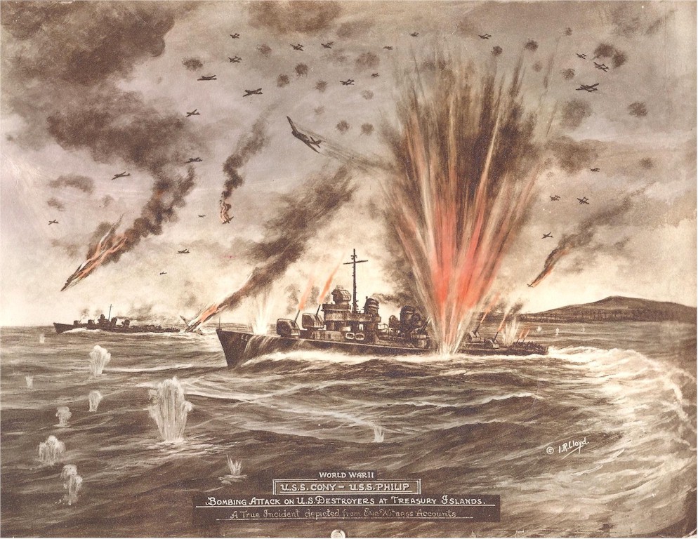| 258k | Painting of the USS Philip (DD-498) and USS Cony (DD-508) on October 27 1943, the destroyers fired at mortar emplacements on Mono Island and then came into Blanche Harbor, Treasury Island, Solomons. Six Val-type enemy planes zoomed into the harbor in an attempt to destroy the transports sitting there. The attack was repelled and Philip did her share by sending one plane away in flames. From the collection of Jesse E. Robson served on the USS Philip in WWII. | Kathleen A. Robson | |
