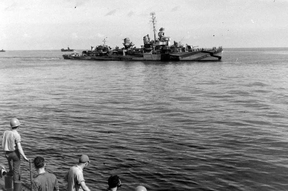 | 32k | Wearing the spurious hull number "298," as seen from St. Paul (CA-73). Still frame from the 1965 film In Harm's Way. Note the fake 5" mount over the Weapon Alfa mount. | John Dapper | |