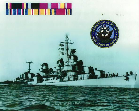 "For outstanding heroism as a Fire Support Vessel and Radar Picket Ship during the Okinawa Campaign, from April 1 to 19, 1945, and June 19 to 24, 1945. A natural and frequent target for heavy Japanese aerial attack while occupying advanced and isolated stations, the U.S.S. ANTHONY defeated all efforts of enemy Kamikaze and dive-bombing planes to destroy her. Constantly vigilant and ready for battle, she sent out early air warnings, provided fighter direction and, with her own gunfire, downed eleven hostile planes and routed many more; she furnished close fire support for initial landings and advances and participated in shore bombardment missions, and she rendered valiant service in preventing air attacks in strength against the Naval forces off the Okinawa beachhead. A seaworthy, fighting ship, the ANTHONY, her officers and men achieved a gallant combat record which attests the teamwork, courage and skill of her entire company and enhances the finest traditions of the United States Naval Service."