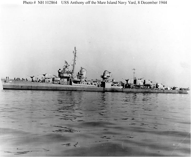 71k | Photo #: NH 102865, USS Anthony (DD-515) off the Mare Island Navy Yard, California, 8 December 1944. Official U.S. Navy Photograph, from the collections of the Naval Historical Center. | Tony Cowart |