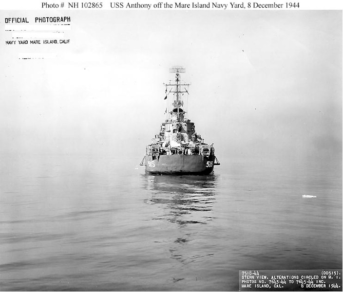 83k | Photo #: NH 102864, USS Anthony (DD-515) off the Mare Island Navy Yard, California, 8 December 1944. Official U.S. Navy Photograph, from the collections of the Naval Historical Center. | Tony Cowart |