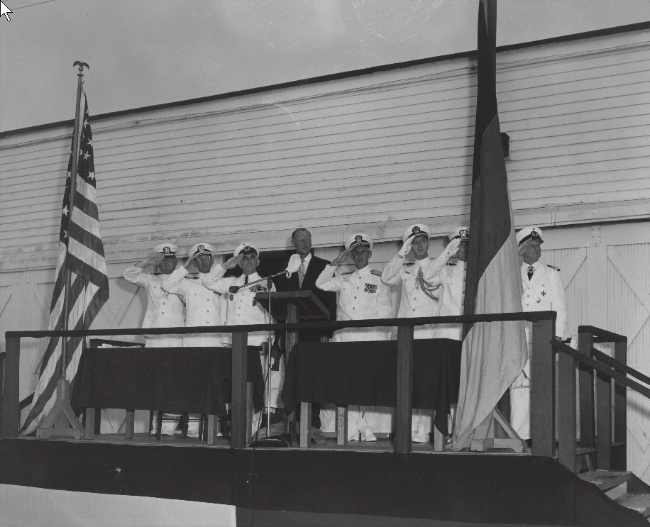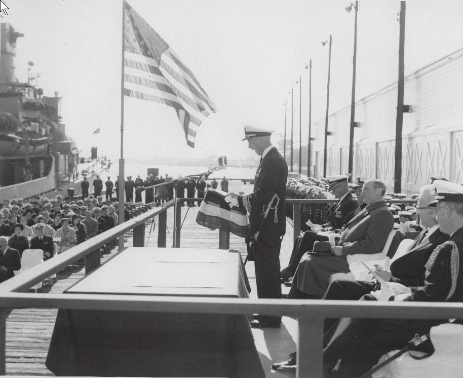January 17 1958 Rear Admiral G. C. Crawford, Commandant, Sixth Naval District, addresses distinguished guests during ceremonies today at US Naval Base Charleston, SC where US destroyer Anthony was transferred to custody of West German Navy. | Mike Mohl |