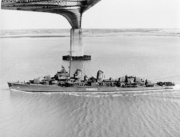 | 89k | Kimberly passing under the Cooper River Bridge, Charleston, SC, fall 1945. Her name painted amidship indicates she is returning from the Navy Day parade at New York City in October 1945. | Charles Good / Ed Grune |
