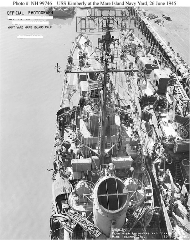 | 170k | USS Kimberly (DD-521), looking forward, while the ship was at the Mare Island Navy Yard, California, on 26 June 1945. Note the cap of her forward smokestack, and the antenna for her SC-2 air search radar atop the foremast. Official U.S. Navy Photograph from the collections of the U.S. National Historical Center. Photo # NH 99746. | Robert Hurst |