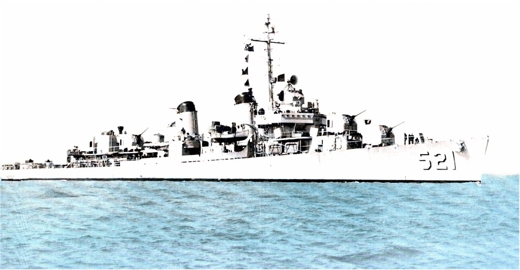 113k | Kimberly (DD-521) underway, probably off Charleston Navy Yard after her 1951-52 recommissioning/refit. Framed photo given to GM3 William H. Reinbott upon his discharge from the Navy. Photo submitted by his son, Rick Reinbott. | Rick Reinbott |