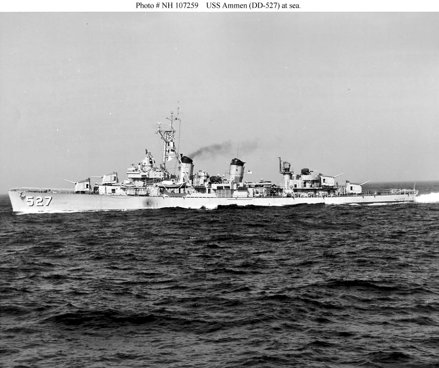 | 155k | USS Ammen (DD-527) underway at sea off Newport, Rhode Island on 4 June 1953. Official U.S. Navy Photograph, from the collections of the Naval History and Heritage Command. Photo #: NH 107259. | Robert Hurst |