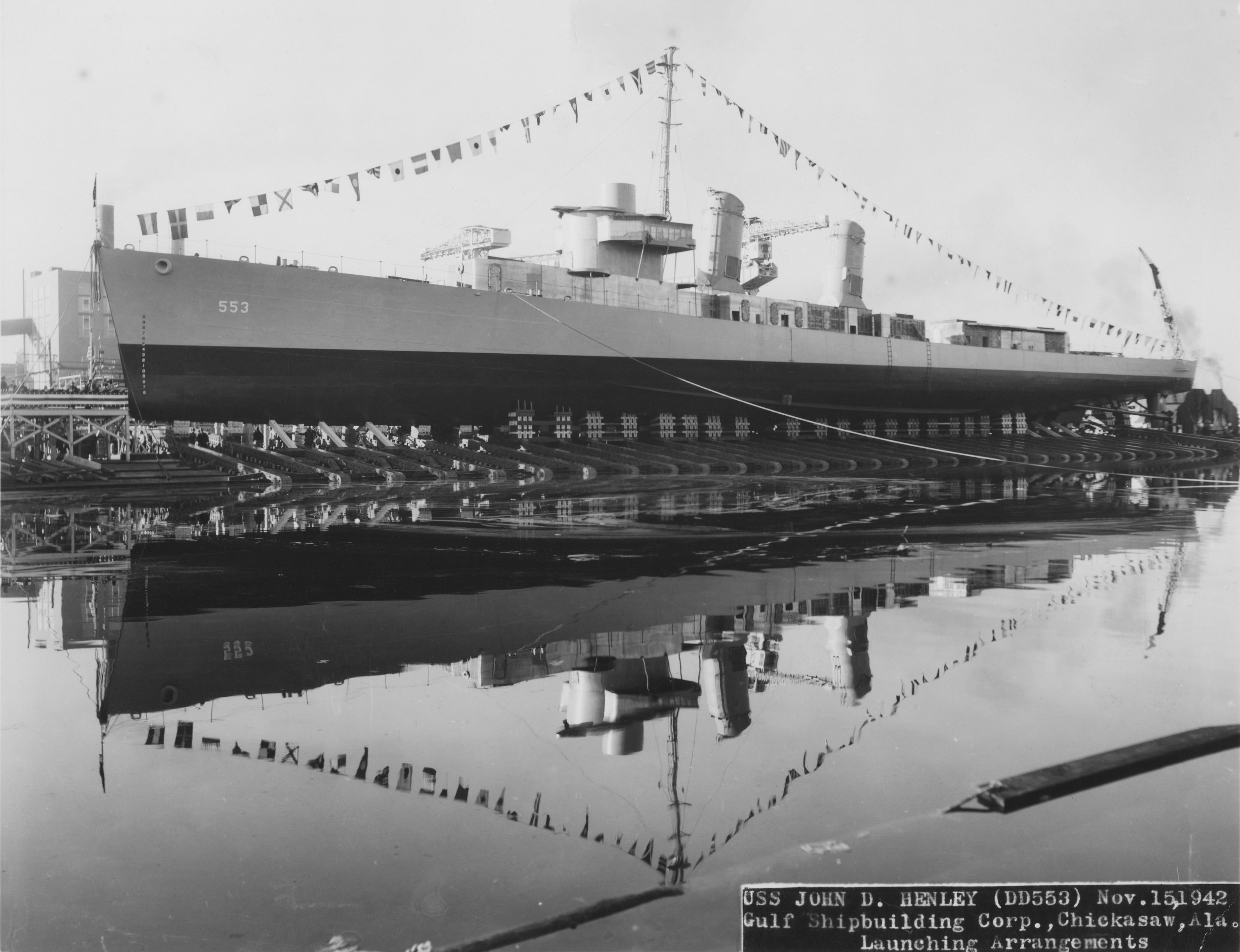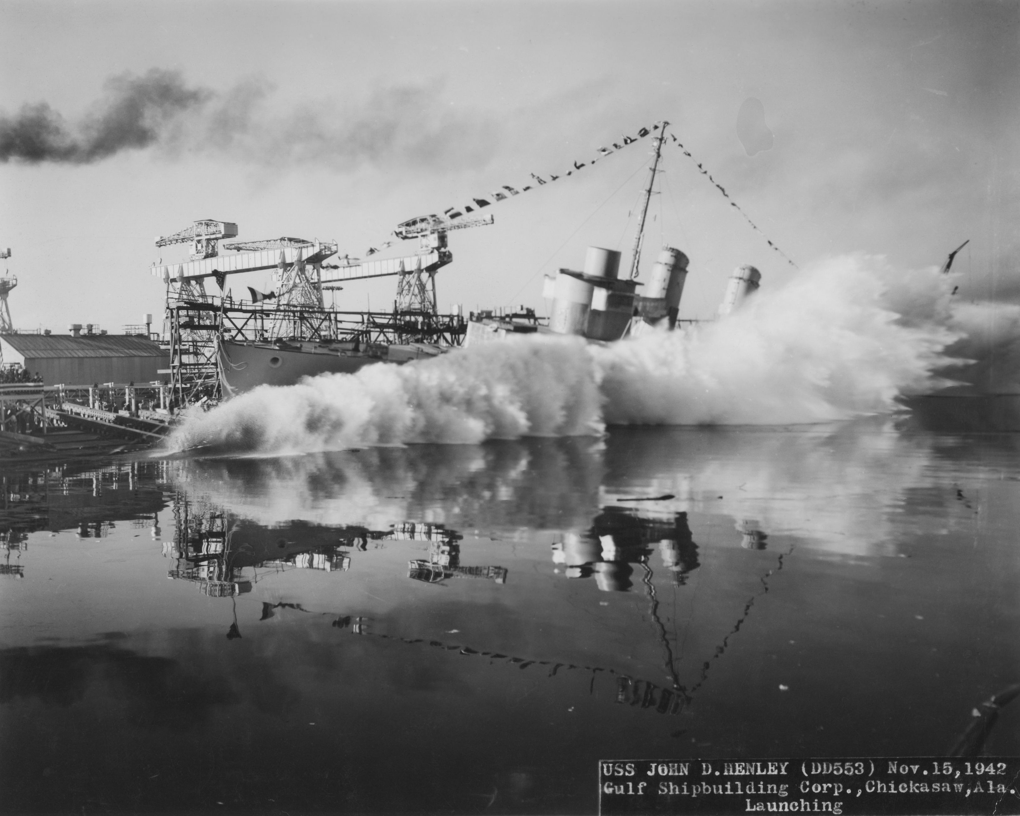 ![]() Three sequential photos of John D. Henley being launched, 15 November 1942. Bureau of Ships photos now in the National Archives | John Chiquoine and Dave Schroeder | |||