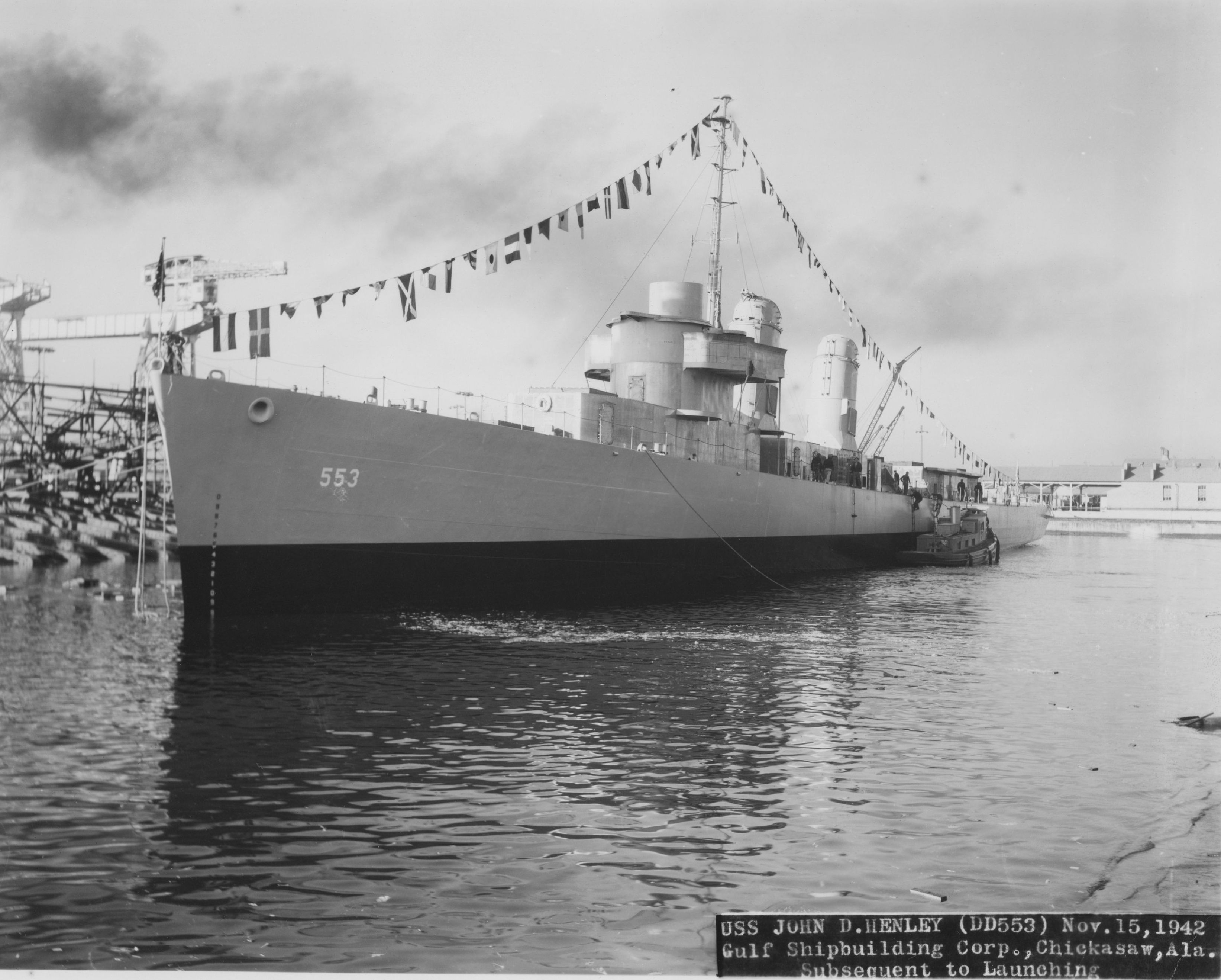 97k | The third Henley (DD-553) was named for John Dandridge Henley, born in Williamsburg 25 February 1781. His brother was Captain Robert Henley, namesake of DD-39, 391 and 762. Commissioned midshipman 14 August 1799, Henley served in Chesapeake, cruising in the West Indies until 1801. Departing Baltimore in the schooner Vixen 3 August 1803, he joined the Mediterranean Squadron for the War with Tripoli. Serving as an officer in Gunboat No. 6 under Lieutenant John Trippe, Henley participated in the attack on Tripoli, 3 August 1804. Gunboat No. 6 ran alongside one of the enemy's large boats and with nine men, Trippe and Henley stormed the Tripolitan before the gunboat fell away from the enemy. Although outnumbered three to one, the Americans fought so fiercely that within a few minutes the enemy struck their colors. Fourteen of the enemy had been killed and 22 were taken prisoner. Both Trippe and Henley were highly commended for their bravery in this action. Following completion of his tour in the Mediterranean in 1805, Henley made a merchant voyage to distant ports and then in September 1807, assumed command of Gunboat No. 20. Henley then served a tour in Washington and with the outbreak of war against the British was ordered to Charleston in June 1813 to command schooner Carolina. His ship was destroyed 27 December 1814 off New Orleans during a fierce struggle in which the few small warships available played a decisive role in delaying the powerful British attack and bringing victory to the American forces. For his part in the victory at New Orleans 8 January 1815 Henley was highly commended by General Andrew Jackson. Promoted to Captain 5 March 1817, Henley commanded John Adams in the West Indies and Congress in the Indian Ocean before taking command of Macedonian in the struggle against West Indian pirates during 1822. Captain Henley served as commandant of the Charleston and Baltimore stations and the Portsmouth Navy Yard, New Hampshire, 1826 to 1832. On 16 August 1832 he was given command of the West India Squadron with Vandalia as his flagship. Captain Henley died on board Vandalia at Havana, Cuba, 23 May 1835. |