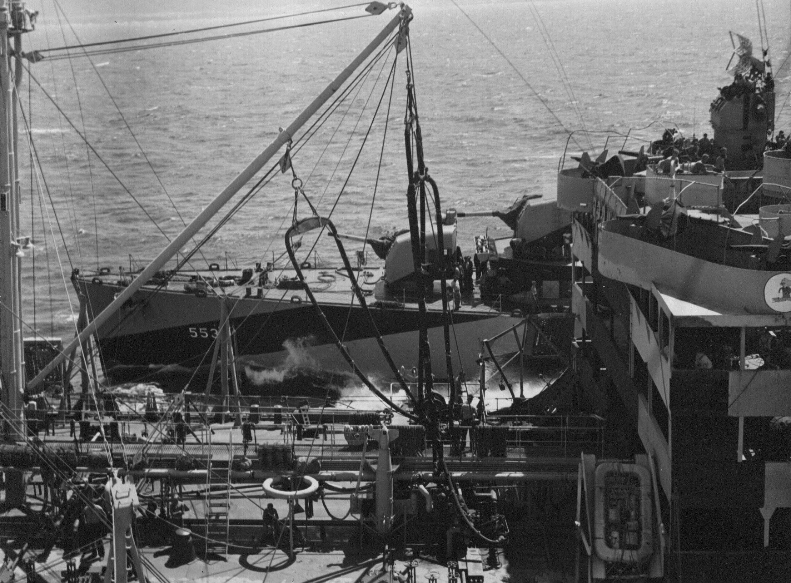 844k | John D. Henley refuelling from an unidentified oiler, 1944. National Archives photo from 80-G series |