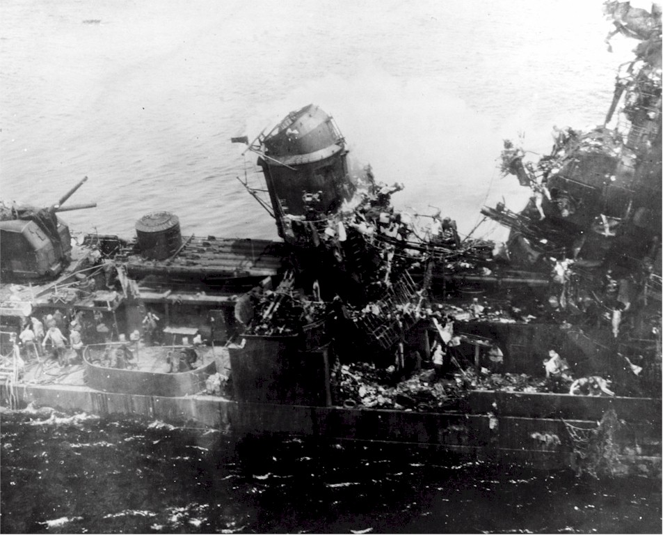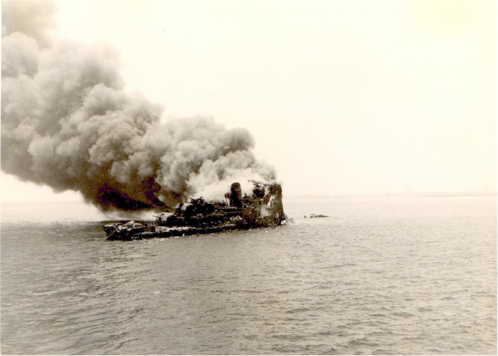 | 180k | USS Longshaw (DD-559) three minutes after the forward magazine of the ship blew up. Photo was taken with an artillery flare by III PHIB Corps (COMPHIBFORPAC), 18 May 1945. The ship was hit by a Japanese coastal battery off Okinawa. Courtesy of Fleet Admiral Nimitz. Source: Naval History and Heritage Command, Photo No. NH 62570. | Robert Hurst/Mike Green | |