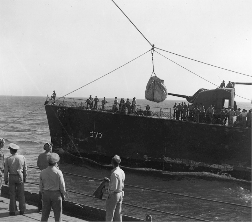 | 119k | USS Sproston (DD-577) coming alongside USS Coral Sea (CVA-43) for refueling, while operating in Hawaiin waters on 9 January 1965. Photographer: PH3 P.L. Singh. Converted for anti-submarine warfare in 1949-1950 and redesignated DDE-577, Sproston reverted to DD-577 on 30 June 1962. Official U.S. Navy Photograph, from the collections of the Naval History and Heritage Command. Photo #: NH 107266. | Robert Hurst |