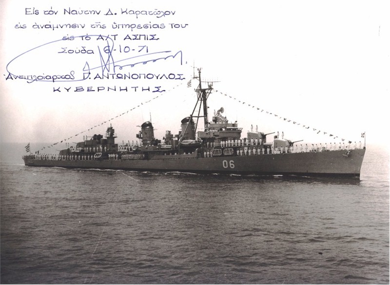 106k | June 1971 in the Saronic Gulf, near Piraeus (the Athens’s port), Greece. Picture caption reads: "To the sailor D. Karatolos, in memory of his service in the ASPIS" and signed George Antonopoulos, Commander. | D. Karatolos |