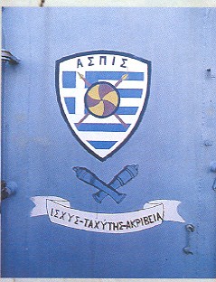 30k | HNS ASPIS, D 06, ex-USS Conner, DD 582, the ship logo as painted on her superstructure, " Power-Speed-Accuracy." ASPIS stands for SHIELD in Greek language. | Anthony J. Vrailas |