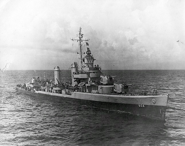 | 129k | Undated photo of the USS Parker (DD-604) underway, location unknown. USN photo | Mike Green | |