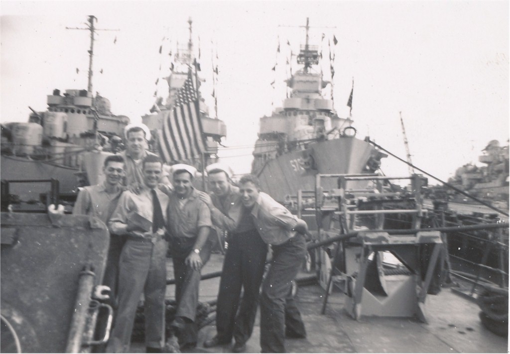 | 123k | Crewmen on Parker's stern, probably at Charleston Navy Yard, January 1946. L-R: Y1c Ernest Kovach, Sea1c James W. Rector, G. A. Peters, SK1c Rudolph J. Tortorici, Y1c Herbert T. Smith & Y3c Robert E. Todd. | Steve Franklin | |