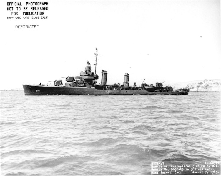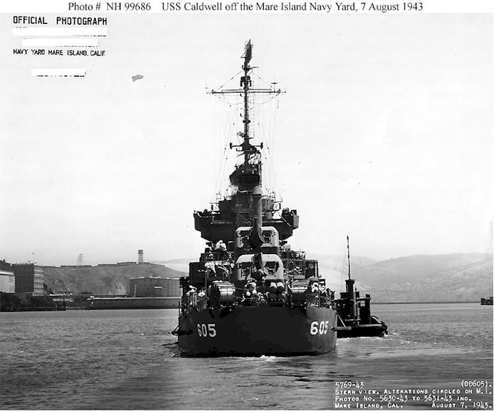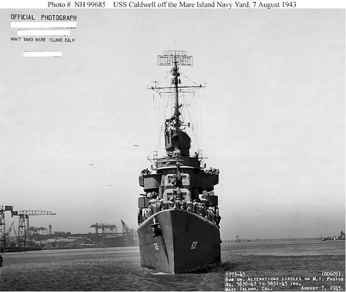 | 87k | Photo #: NH 99685, USS Caldwell (DD-605) off the Mare Island Navy Yard, California, 7 August 1943. Official U.S. Navy Photograph, from the collections of the Naval Historical Center. | Tony Cowart |