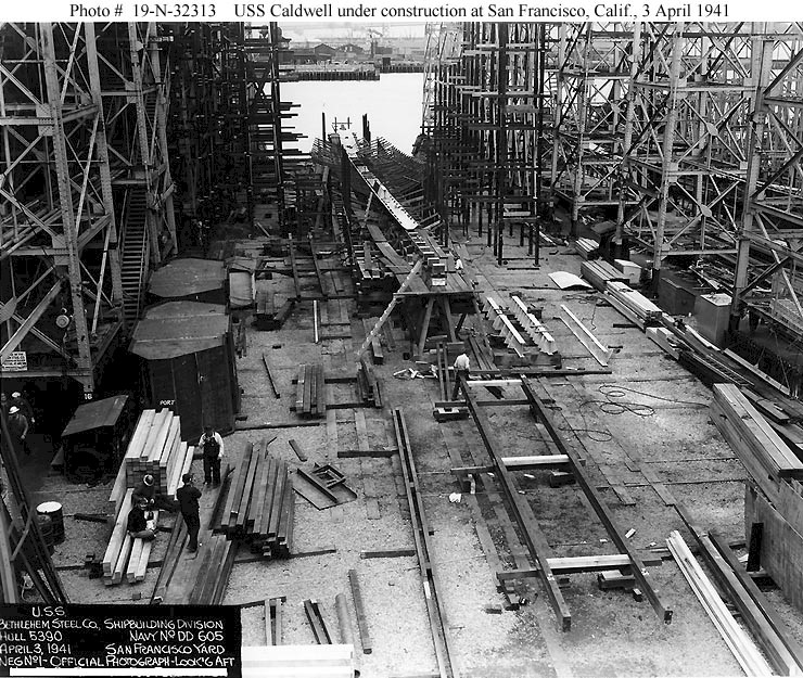 | 226k | USS Caldwell (DD-605) view looking aft, while she was in the early stages of construction at the Bethlehem Steel Company shipyard, San Francisco, California, 3 April 1941. Her keel had been laid on 24 March. Photograph from the Bureau of Ships Collection in the U.S. National Archives. Photo #: 19-N-32313. | Robert Hurst |