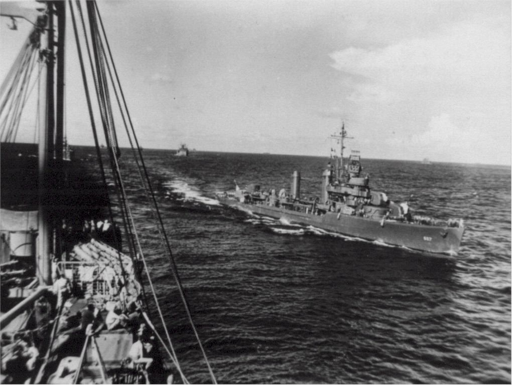 | 182k | USS Frazier (DD-607) enroute from Hawaii to Saipan in June 1944, as part of the invasion fleet. The picture was taken from a transport carrying men of the 2nd Marine Div. Photo is from the collection of Cpl. Tom Carter (USMC), Combat Photographer, who was in the invasion force. | Jack Wolslegel/Rick E Davis | |