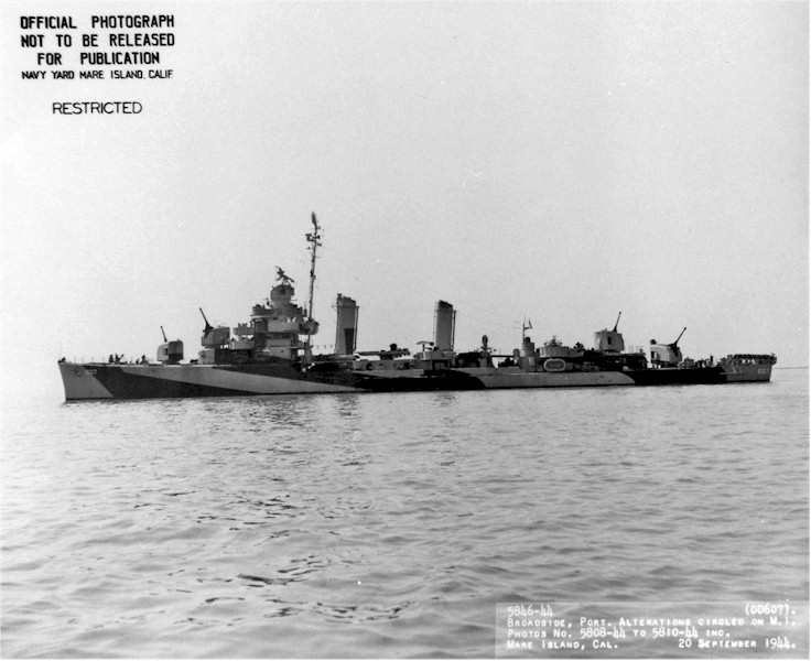 95k | Broadside view of USS Frazier (DD 607) off Mare Island on 20 Sep 1944. She was in overhaul at Mare Island from 7 Aug. until 19 Sep 1944. | Darryl Baker | |