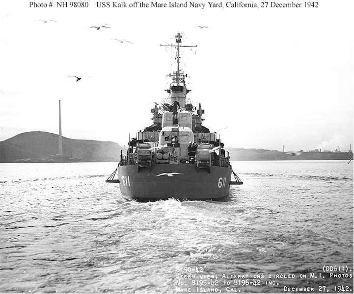 | 109k | USS Kalk (DD-611) Off the Mare Island Navy Yard, California, 27 December 1942. Note large smokestack on the shore, at left, and the many seagulls flying near the ship. Official U.S. Navy Photograph, from the Collections of the Naval Historical Center. | Fred Weiss | |