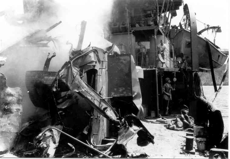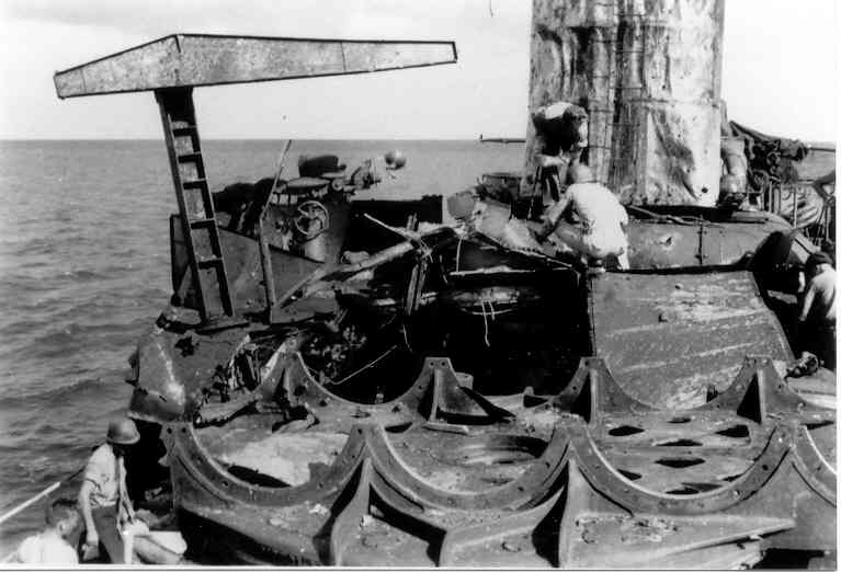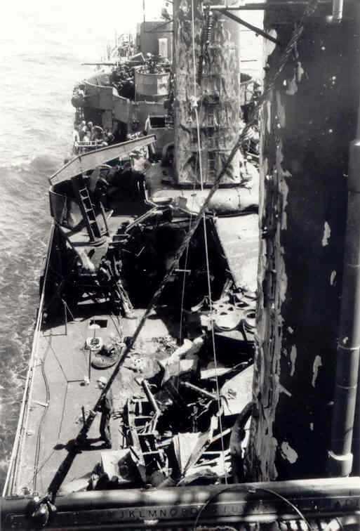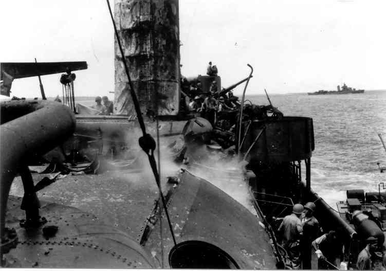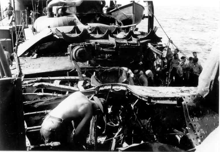 | 28k | This photo and the next 22 show the aftermath of a bomb blast aboard the Kalk on June 12 1944. This photo displays looking aft Starboard side #2 stack, & #7-20mm mount. | Gary L. Edmisten | |