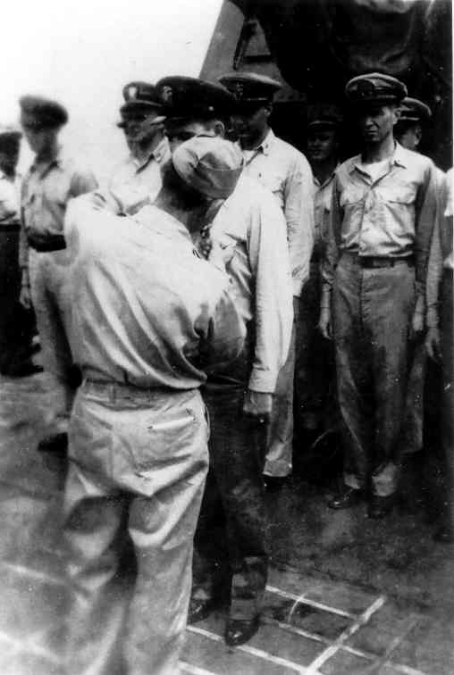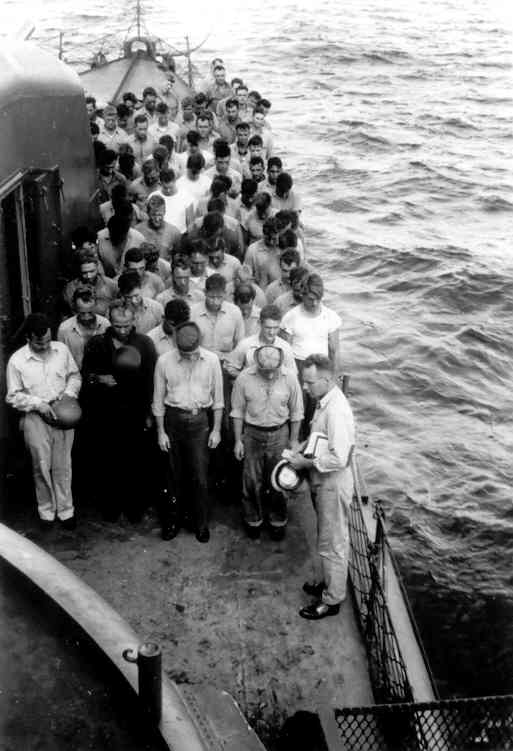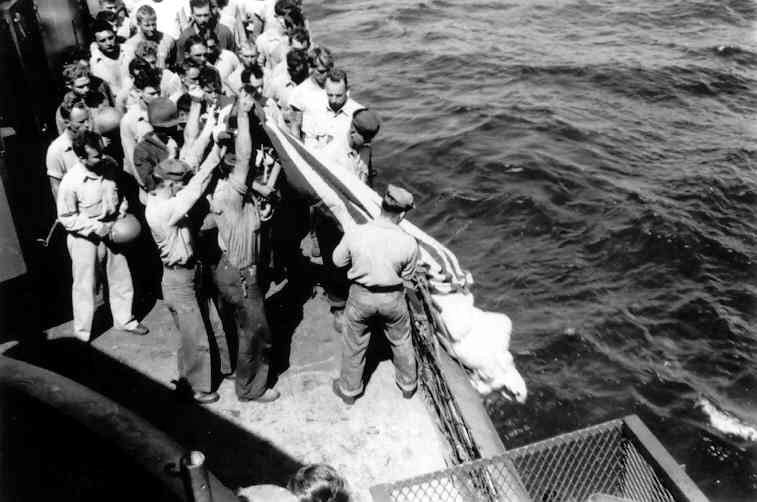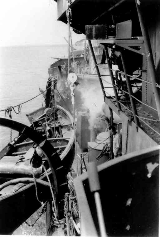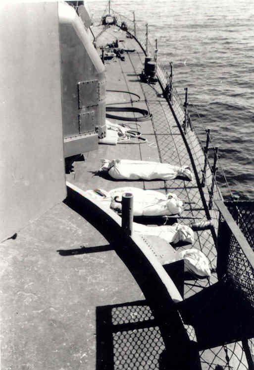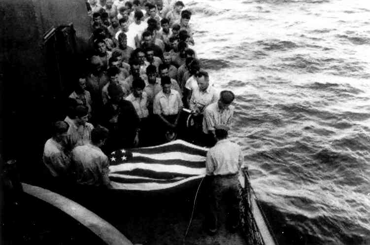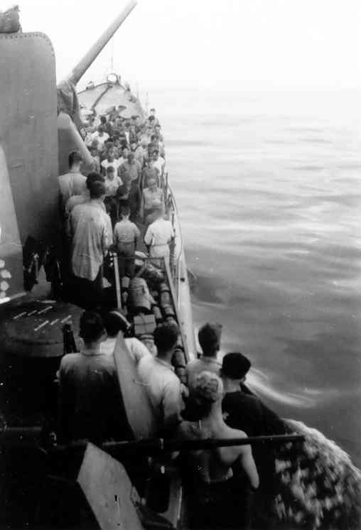| 36k | This is the burial at sea of James Leon Johnson, Chief Machinist, 13 June 1944. This was held the day after and late in the afternoon from when the KALK was hit. The ship is being towed by USS Stockton at that moment. Capt. H.D. Fuller at the front. | Gary L. Edmisten | |