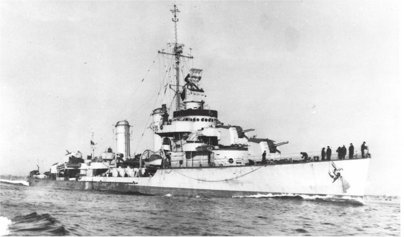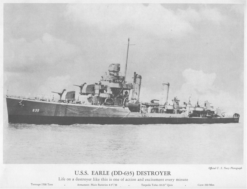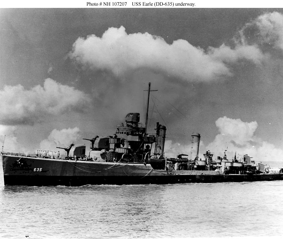 | 155k | USS Earle (DD-635) underway with the crew at quarters for either leaving or entering port on June 10 1943. This photograph was retouched by wartime censors to remove radar antennas atop her foremast and Mark 37 gun director. Official U.S. Navy Photograph, from the collections of the Naval History and Heritage Command. Photo #: NH 107207. | Robert Hurst |