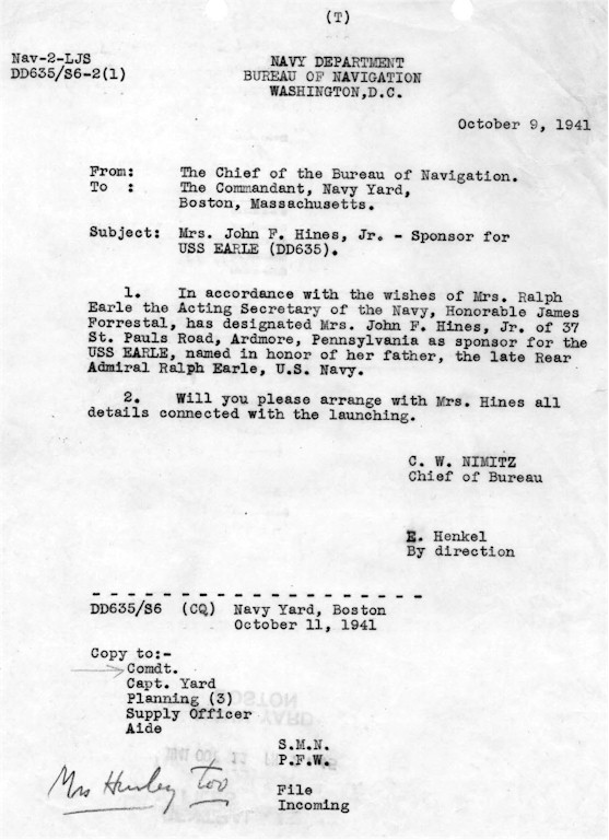 | 104k | The Boston Navy Yard maintained files concerning ship launchings, which provide an insight into the logistics required to undertake one of the most significant moments in the life of a naval vessel. This sequence relates to the launching of USS Earle (DD-635) on 10 December 1941. This memorandum dated 9 October 1941 from the Bureau of Navigation in Washington notified the Navy Yard Commandant of the identity of the sponsor for USS Earle and directed him to arrange the details of the ceremony with her. Note the name of the bureau chief, then an obscure naval officer but soon to become one of the best-known naval figures of World War II, Chester W. Nimitz. (Records of the Boston Naval Shipyard, Boston National Historical Park Collection, NPS Cat. No. BOSTS-15404). | Stephen P. Carlson, Boston NHP, Charlestown Navy Yard |