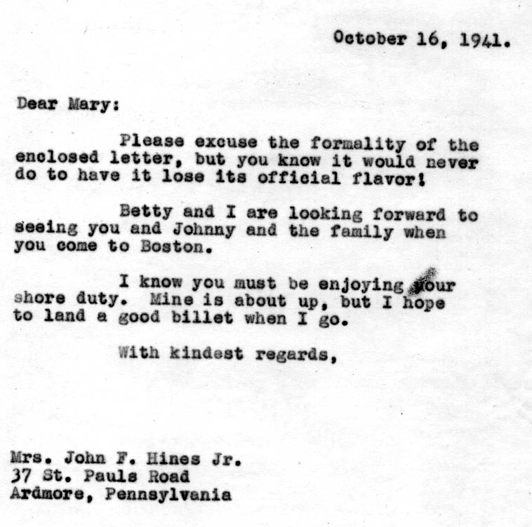 | 75k | One of the most interesting items in the file is this informal note which accompanied the formal notification letter. It reveals that Cmdr. Schumm was a friend of Mrs. Hines, whose husband was a fellow Navy officer, and is the only document in the file to address Mrs. Hines by her own given name. (Records of the Boston Naval Shipyard, Boston National Historical Park Collection, NPS Cat. No. BOSTS-15404). | Stephen P. Carlson, Boston NHP, Charlestown Navy Yard |