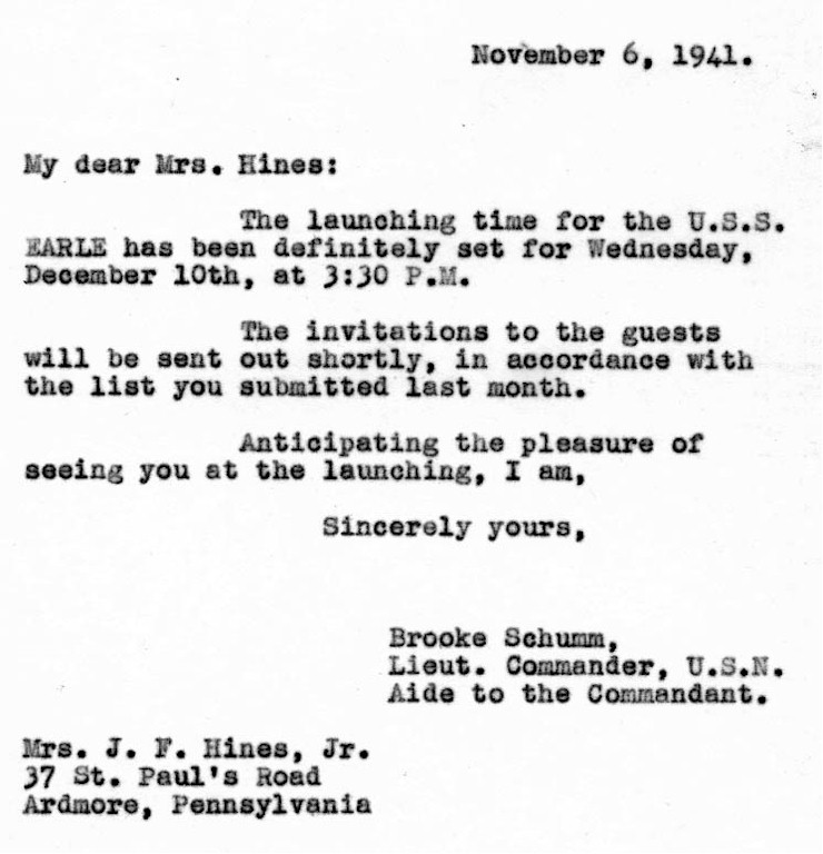| 152k | On 16 October 1941 Aide to the Commandant Lt. Cmdr. Brooke Schumm sent this letter to the sponsor informing her of the tentative date of the launching and asking for her guest list. (Records of the Boston Naval Shipyard, Boston National Historical Park Collection, NPS Cat. No. BOSTS-15404). | Stephen P. Carlson, Boston NHP, Charlestown Navy Yard |