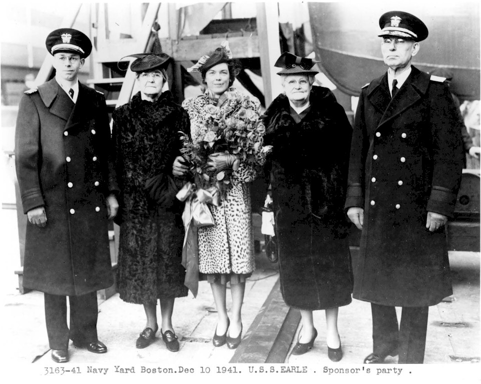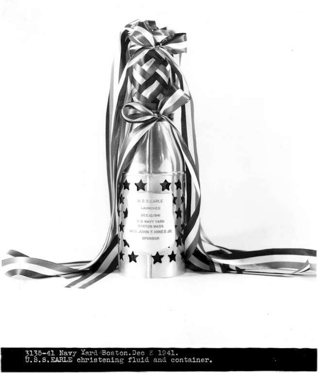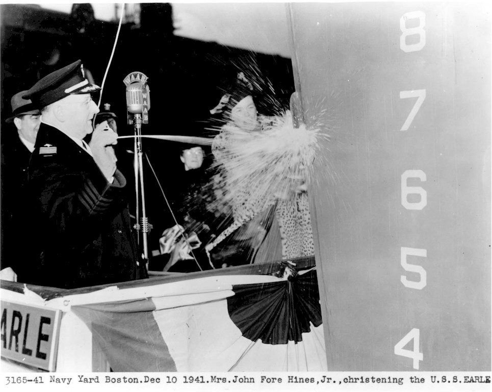 | 136k | Mrs. Hines christens USS Earle (DD-635) on 10 December 1941, three days after the Japanese attack on Pearl Harbor brought the county officially into World War II. (U.S. Navy photo NY2 3165-40, Boston National Historical Park Collection, NPS Cat. No. BOSTS-11011). | Stephen P. Carlson, Boston NHP, Charlestown Navy Yard |