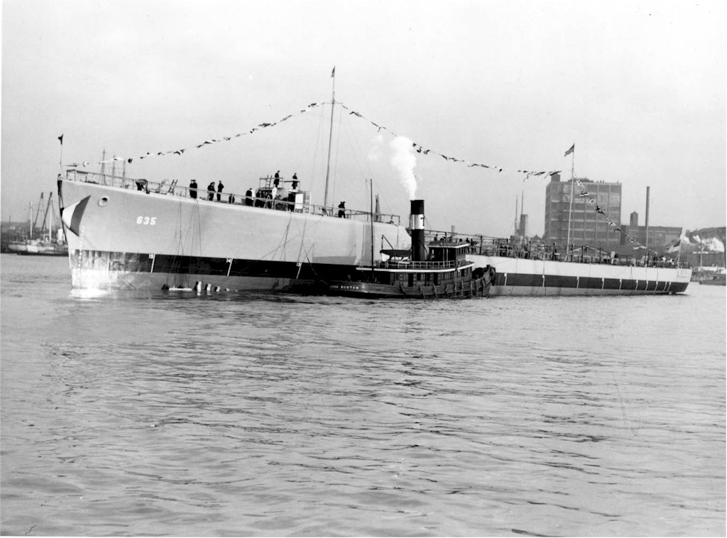| 152k | A tugboat has taken charge of the newly-launched destroyer and is beginning to maneuver her away from the Shipways towards her fitting out location. Note the remains of the launching cradle under the hull to the right of her number. (U.S. Navy photo NY2 3168-40, Boston National Historical Park Collection, NPS Cat. No. BOSTS-11011). | Stephen P. Carlson, Boston NHP, Charlestown Navy Yard |