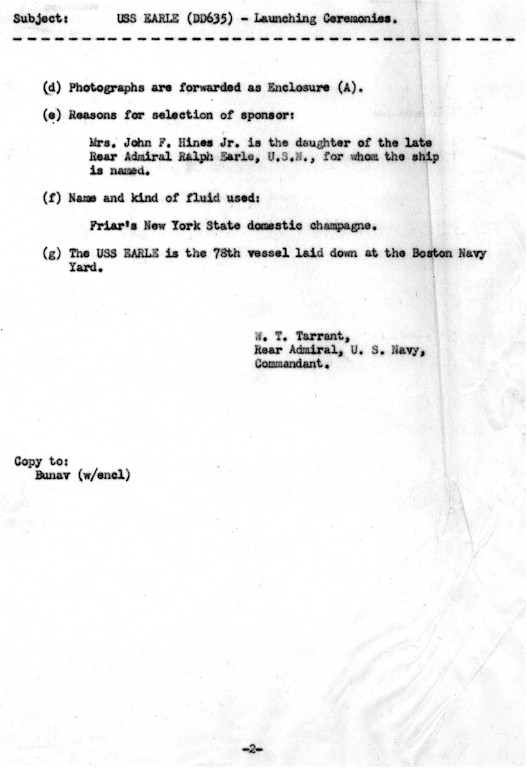 | 91k | Following the christening and launching, the Commandant submitted a formal report to the Bureau of Ships. It enclosed copies of the photographs taken on the occasion, and provided information on the sponsor and her party as well as other distinguished guests. (Records of the Boston Naval Shipyard, Boston National Historical Park Collection, NPS Cat. No. BOSTS-15404). | Stephen P. Carlson, Boston NHP, Charlestown Navy Yard |