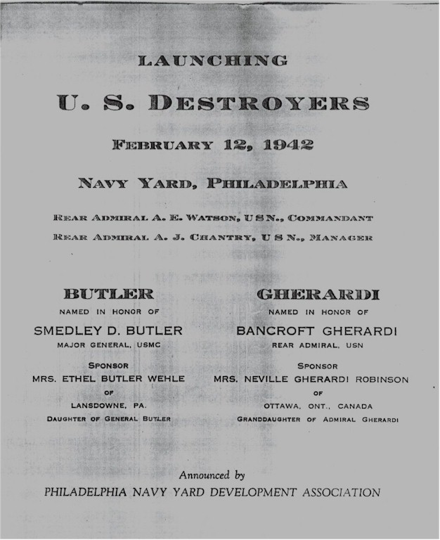 | 156k | Photo #: NH 99109 USS Gherardi (DD-637), at left, and USS Butler (DD-636) ready for launching, at the Philadelphia Navy Yard, Pennsylvania, on 12 February 1942. Courtesy of the Naval Historical Foundation. Collection of Rear Admiral Adolphus E. Watson, USN, donated by Mrs. Alexander C. Liggett and Mrs. J.S. Taylor. Official U.S. Navy Photograph, from the collections of the Naval Historical Center. | Tony Cowart | |