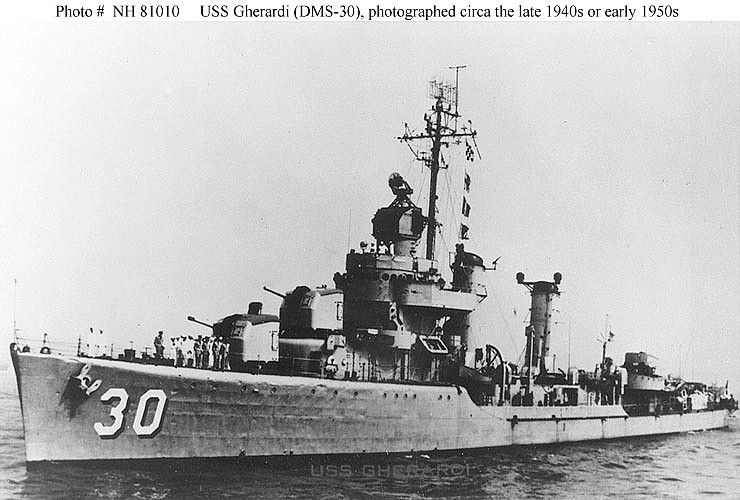 | 87k | USS Gherardi (DMS-30) Photographed circa the later 1940s or the early 1950s. Courtesy of Donald M. McPherson, 1974. U.S. Naval Historical Center Photograph. | Fred Weiss | |