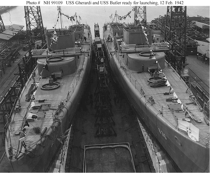 | 80k | Photo #: NH 99111 USS Gherardi (DD-637), at left, and USS Butler (DD-636) ready for launching, at the Philadelphia Navy Yard, Pennsylvania, on 12 February 1942. Courtesy of the Naval Historical Foundation. Collection of Rear Admiral Adolphus E. Watson, USN, donated by Mrs. Alexander C. Liggett and Mrs. J.S. Taylor. Official U.S. Navy Photograph, from the collections of the Naval Historical Center. | Tony Cowart | |