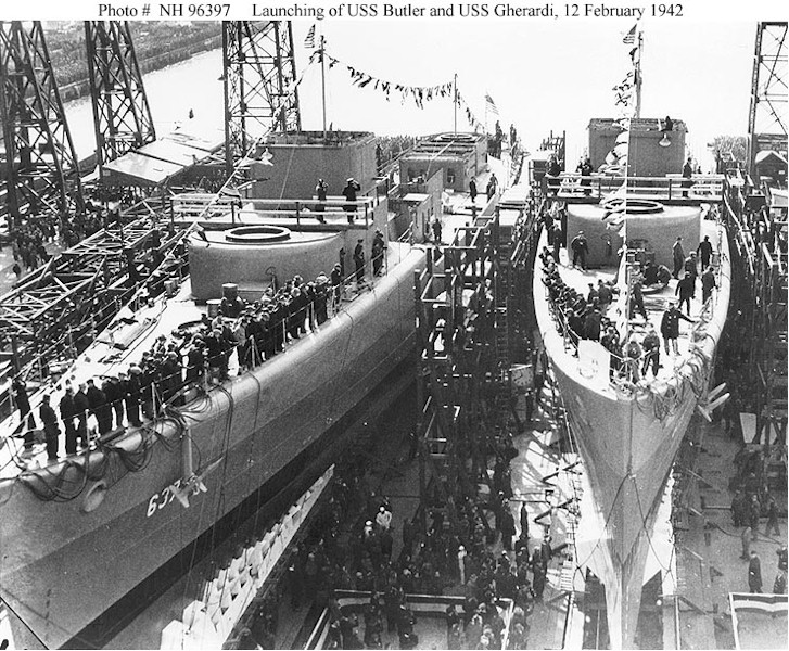 | 190k | Photo #: NH 96397 USS Butler (DD-636), at right, starts to slide down the ways during launching ceremonies at the Philadelphia Navy Yard, Pennsylvania, 12 February 1942. USS Gherardi (DD-637), which was launched immediately afterwards, is at left. Courtesy of the U.S. Naval Institute Photo Collection, Annapolis, Maryland. Collection of James C. Fahey. Official U.S. Navy Photograph, from the collections of the Naval Historical Center. | Tony Cowart | |
