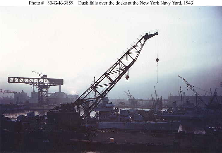 | 53k | New York Navy Yard, Brooklyn, New York. Dusk falls over the Navy Yard docks, circa June-September 1943. The ship in the centre, just beyond the crane, is USS Gherardi (DD-637). USS Luce (DD-522) is at left, with only her bow visible. USS Butler (DD-636) is at right, with only her stern visible. USS Doyle (DD-494) is in the right background. A British light cruiser, painted in yellow primer, is in the left background (USN Photo No 80-G-K-3859). | Robert Hurst | |
