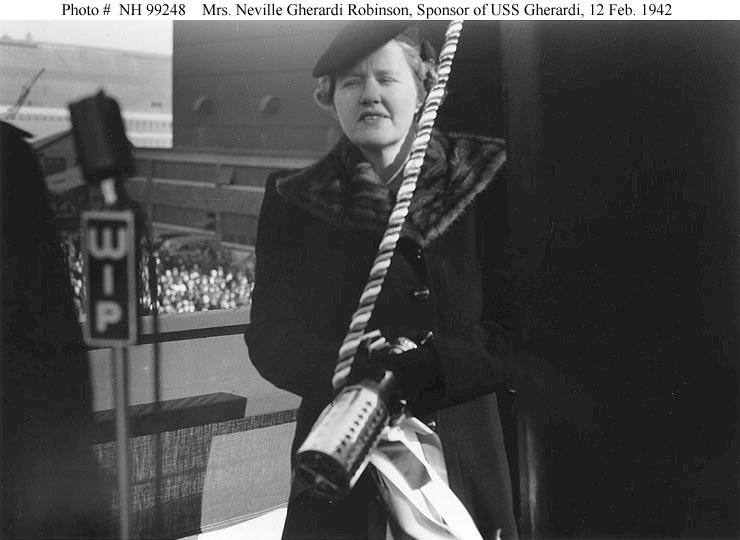 | 66k | Mrs. Neville Gherardi Robinson, Ship's Sponsor, of USS Gherardi (DD-637), holds the christening bottle, during launching ceremonies at the Philadelphia Navy Yard, Pennsylvania, 12 February 1942. Courtesy of the Naval Historical Foundation. Collection of Rear Admiral Adolphus E. Watson, USN, donated by Mrs. Alexander C. Liggett and Mrs. J.S. Taylor. Official U.S. Navy Photograph, from the collections of the Naval Historical Center. Photo #: NH 99248. | Robert Hurst | |